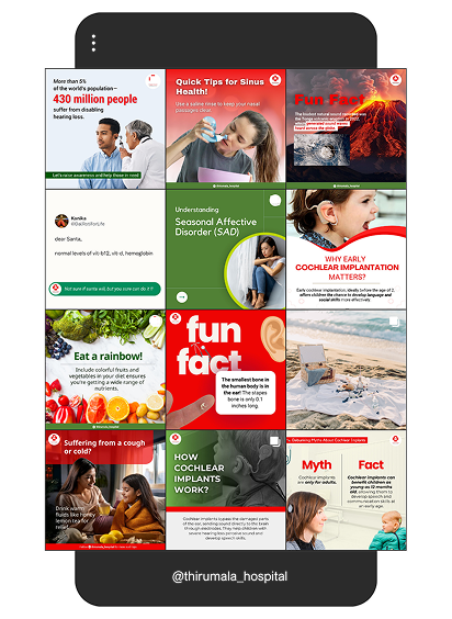 A content strategy was developed focusing on educational, promotional, and informational posts. The approach raised awareness about ENT health, shared success stories, and provided expert insights through engaging graphics, articles, and interactive Q&A sessions, driving organic engagement. This kept the hospital’s social media active and informative without relying on paid ads, leading to increased follower engagement, patient inquiries, and positioning the hospital as a trusted voice in ENT care.